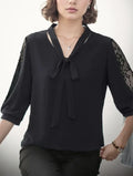 Crafted from a lightweight, flowy fabric with delicate lace inserts along the sleeves, this blouse blends sophistication and charm in perfect harmony. The bow tie neckline adds a romantic touch, while its variety of beautiful colors lets you express your unique style — from classic tones to bold, modern shades.